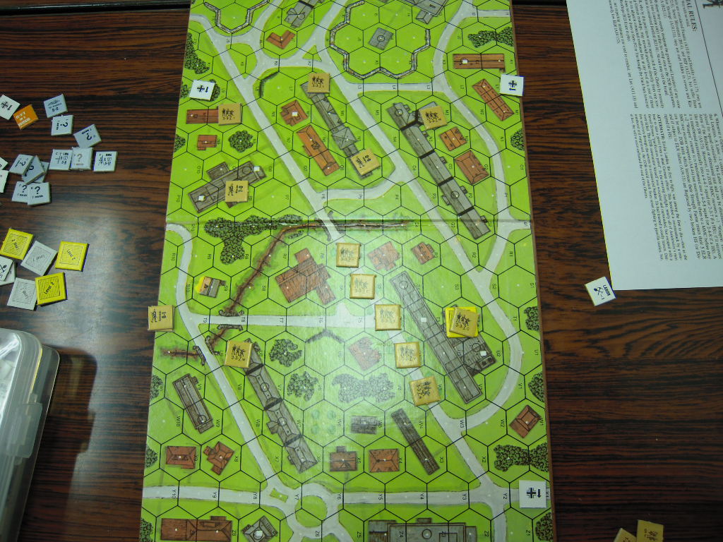 | 2024-03-28 | (A) Nate Gregg | vs | Chris Gregg | Partisan (ZOB) win (VASL Log) | It was probably a foolish decision, but I was determined to win via the Mopping Up VC conditions. Through turn 7 I had 21 buildings mopped up, and three in the works on Turn 8 which would have put me at 24 thru turn 8 with two for sure easy ones (P2 rowhouse and X6). Then suddenly, the flame in W5 (fortified), which had broken the Partisans previously occupying it, burst in a Blaze cause my 2 HS to break, one of which was to advance into X6 for Mopping Up the following turn. So much for that plan. My brother, and opponent, also let me know that the large building, V2, also had some HIPsters in it, so despite me probably winning the melee in Turn 8, my Mopping Up attempt in Turn 9 would have failed. ATTACHED LOG is my boxcars roll for fire spread in W5 Fortified Building. Mopping Up method is really really difficult. I set out on a mission to achieve it, and missed. Perhaps another 1/2 turn for the Germans would have been enough. And perhaps that's an errata idea: The Germans can elect the Mopping Up method of VC, but must do so at onset of scenario, but by doing so, make the game 9 1/2 turns in length rather than 8 1/2 turns. |