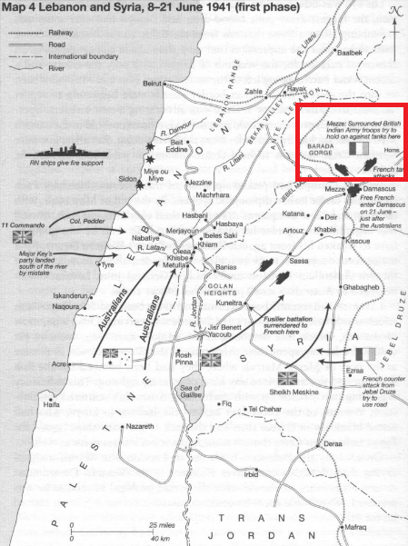 The Allied invasion of Syria and Lebanon was conducted primarily by the 7th Australian Division, the 5th Indian Infantry Brigade and the brigade-strength Free French Division. A week later they were about ten miles south of Damascus but facing strong Vichy defenses. The veteran Indian brigade broke through to the city’s outskirts, only to find itself cut off and sorely pressed. On the right, the Free French seized all the steep, boulder-strewn Djebel el Kelb, save for Hill 740 which prevented them from coming to the Indians’ assistance. On the 20th, the Free French made another attempt to overcome this last barrier. . .Attacker: Free French / British (1er Bataillon, 13ème Demi-Brigade de Légion Étrangère / 1ème Compagnie de Chars de Combat / A-T Commando platoon, 5th Indian Brigade)