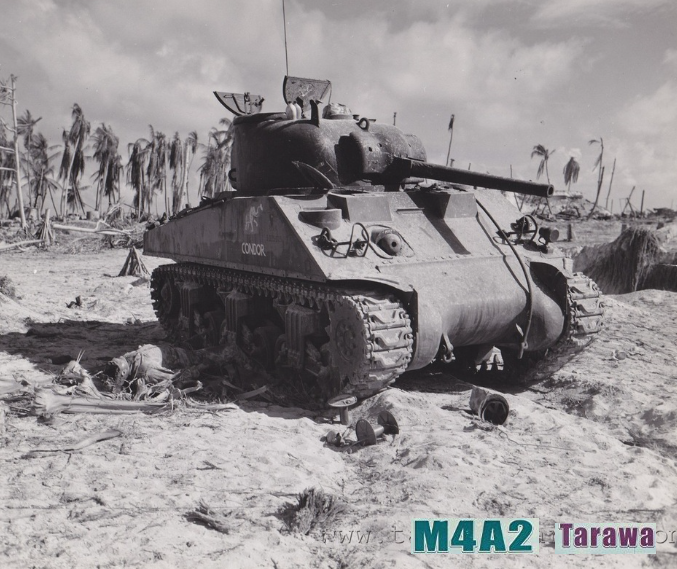 The M4A2 was seen by their crews for the first time aboard the transport Ashland while enroute to "Helen". C Company, 2nd Tank Battalion was given the new monster. 1st Platoon under Lieutenant Edward Bale would take six Shermans to Red Beach One. The Remaining 8 tanks were split evenly to support 2/2, on Red Two, and 2/8 on Red Three. Scouts lead the Shermans to shore under tremendous fire and with great valor Many of the scouts were killed, for every man killed, another would volunteer to take his place. Lt. Bale reached the beach, but was unwilling to run over his dead and dying fellow Marines scattered on the beach. He went back into the water to try and make it to the bird's beak, without the scouts. Four of the Sherman's fell into shellholes drowning out the engines. Lt Bale in China Girl and another tank, Cecilia were the only tanks to make it to the beach that day.Attacker: American (USMC) (2nd and 3rd Battalions, 2nd Marines and 1st Platoon, C Company, 2nd Marine Tank Battalion)