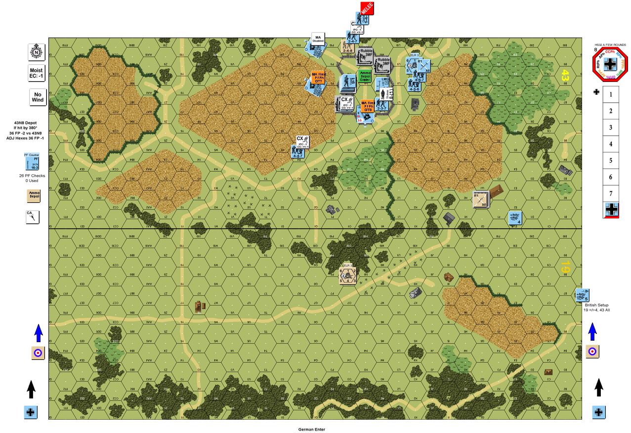 | 2024-03-17 | (D) Vic Lauterbach | vs | JM | German win | Jim wanted the Sturmtigers, so I took the British. I set up to hold 43F2 and 43B3 as long as possible the retreat to the walled farm. GT1 was a disaster. I broke/revealed the 76LL on its first AP shot (after a TH DR > D5). I repaired it, missed a Sturmtiger in my PFPh and got obliterated by it in his DFPh! Jim took my screening positions by GT5 and closed in on the walled farm in GT6. I got two front hits on Sturmtigers that bounced off before losing both PIATs (one broke and got OVR by a Sturmtiger). I hoped Jim couldn't reach the 248 in building 43O10, but MMG fire on a 447 generated a hero who got there with a CX 247 and locked my last HS in melee giving Jim the win! Jim: Pick your 380* shots carefully; you won't get many. I hit the ammo depot* (made building 43M9 rubble) and made 43O7 rubble with a near miss but never hit infantry in a stone building. This is a fun scenario, but the Sturmtigers are frustrating. The German infantry have to win this one which came down to CC in three locations on the last turn. *SSR3 does not give a target type for the ammo depot. We used unarmored vehicle with the no explosion clause NA [E10.6]. | ||