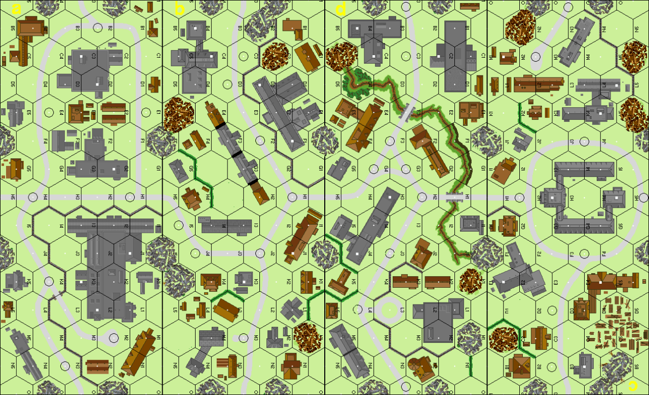 | Misc Rules: | Woods/Brush are Rubble. All orchards are NA. Hex bF1 is Lvl 3. Pre-game Bombardment. D: 2 AFV immob |
