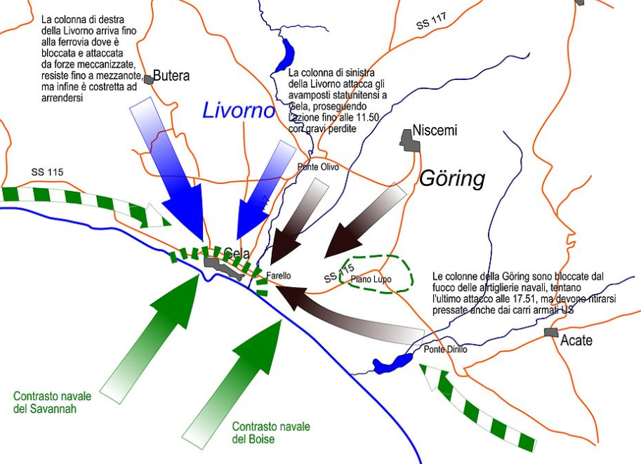 On July 10th, the Allies landed in Sicily — the American VII Corps in the Licata and Gela area and the British at Pozzalo, east of Syracuse. In Gela, Darby’s Rangers successfully fought off a counterattack by the 10-ton French tanks of Gruppo Mobile “E”. The Axis command recovered quickly, however, and planned another counterattack for the next day. The Italian Livorno Division was to move toward Gela and, after its capture, move westward against Licata. Most of the German units went to face the British in the east, leaving only the Hermann Göring Division to support the Italians. The counterattack commenced at 0830 hours. At the time of the attack, General Patton was visiting Ranger headquarters. As he was leaving, he shouted back, “Kill every one of the goddamn bastards!” The cruiser Savannah opened fire with her six-inch guns, hammering the Italian infantry which was advancing under the cover of German tanks. Though stripped of its infantry support, the German armor continued advancing through the naval gunfire, forcing Darby to use makeshift crews to man captured Italian artillery pieces which engaged the German tanks a mere thousand yards from the beach.Attacker: Italian / German (33rd and 34th Regiments, Livorno Division / Schwere Panzer Abteilung 504 Hermann Göring Division)