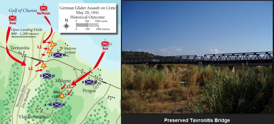 The airfield at Maleme figured prominently in the German plans for the capture of Crete. “Group West”. Commanded most of the 1st Assault Regiment under the command of General Meindl, consisted of three detachments: one to land at the Tavronitis Bridge; one to destroy the AA positions and ease the way for the following troop-carrier transports; and one to land on the slopes of Point 107, high ground to the south of the field. Major Braun drew the task of seizing and holding the long span over the dry Tavronitis. Given free rein to plan his assault, he decided to daringly land in the dry bed itself and then take the British MG posts which guarded each side of the bridge from the rear.Attacker: German (Abteilung Braun, Bataillon 1, Sturm Regiment 1)