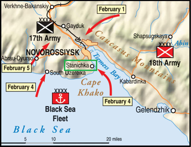 With the German occupation of Sevastopol and Novorossiysk in 1942, the Soviet Black Sea Fleet had lost its primary naval bases. Its operations were shifted farther down the southeast coast to the city of Poti, whose port facilities were small and poorly equipped to serve as a naval base. An even smaller port, Gelendzhik, closer to Novorossiysk, picked up part of the workload. The recapture of Novorossiysk would provide the Soviet Black Sea Fleet with a base large enough to accommodate its naval forces. A diversionary force of 250 men landed on schedule in the vicinity of the small fishing village of Stanichka. Their purpose was to draw attention to themselves and away from the main landing at South Ozereika. Unofficially called smertniki (destined for death), they knew that there was little chance of their survival. Armed only with light infantry weapons, the men, led by Major Cesar L. Kunikov, were all volunteers from the 255th Naval Infantry Brigade. Cesar Kunikov was an experienced and capable officer, distinguished in prior actions on the Azov and Black Seas during 1941 and 1942. His men held him in the highest esteem. Legend has it that when Kunikov called for volunteers for his task force, he announced: “Who wants to go die with me?” More men than were needed stepped forward.Attacker: German (Infanterie Regiment 186, Infanterie Division 73)