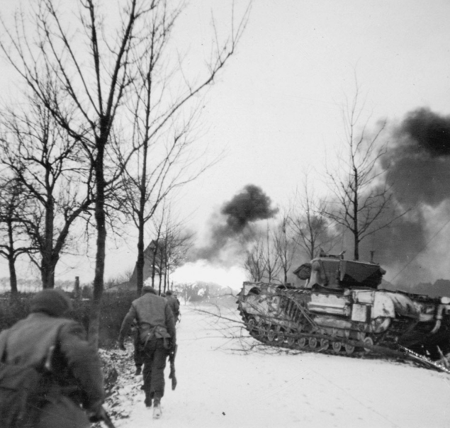 1st Battalion, The Rifle Brigade, supported by Crocodile flame-throwers, attack the village of St Joost, Netherlands, 20 January 1945.