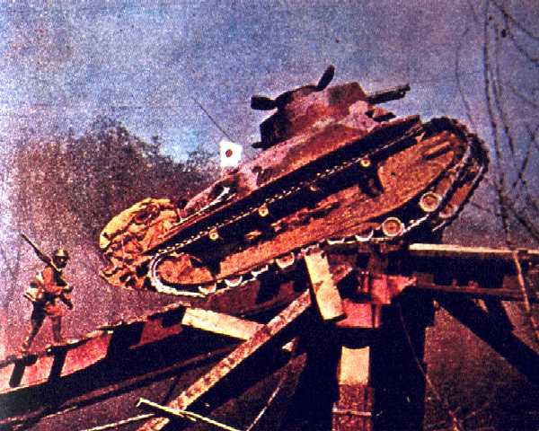 Type 89 Japanses medium tank crossing a makeshift brisge in China, 1938