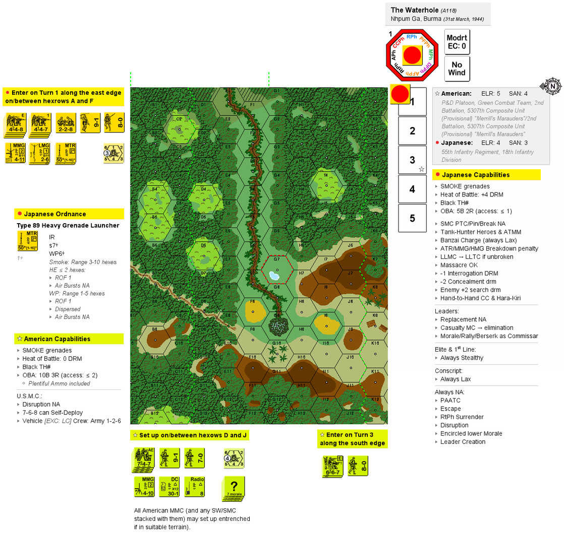 Just north of the hill on the east side of Nhpum Ga lies a water hole at the base of the hill. The hill slopes down steeply to the water hole, which was supplying the entire 2nd Battalion of Merrill's Marauders. Now that the Japanese were all around Nhpum Ga, the water hole was their only source of water. The Pioneer and Demolition Platoon of the Green Combat Team was responsible for holding the water hole and had set up defensive positions at the base of the hill. As a part of the all-out effort to take Nhpum Ga, the Japanese sent a force up the ravine northeast of the village to attack the hill. . . . .Another Nhpum Ga classic. The US player must hold the waterhole from a determined force of Japanese attackers. The US player will NEED the reinforcements when they arrive.Attacker: Japanese (55th Infantry Regiment, 18th Infantry Division)