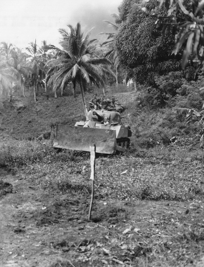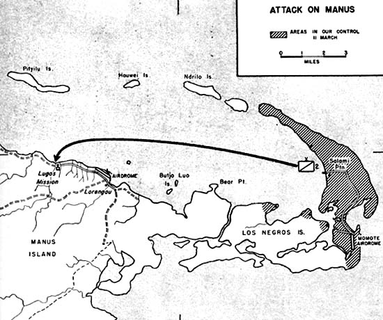 The attack on Manus got underway on 15 March. Before dawn, two troops of the 8th Cavalry, six cargo carrying LVTs and the combat LVT were loaded on board an LST for the 18 kilometres (11 mi) trip across Seeadler Harbour from Salami. Beaches at Lugos, about 4 kilometres (2.5 mi) west of Lorengau were chosen in preference to those nearer Lorengau, which were known to be heavily defended. The Japanese had evidently not expected a landing at Lugos and their positions there were quickly overrun. The 1st Squadron, 8th Cavalry then advanced eastward until it was stopped by a Japanese bunker complex on the edge of the Lorengau airstrip.Attacker: American (2nd Squadron, 8th Cavalry Regiment)
