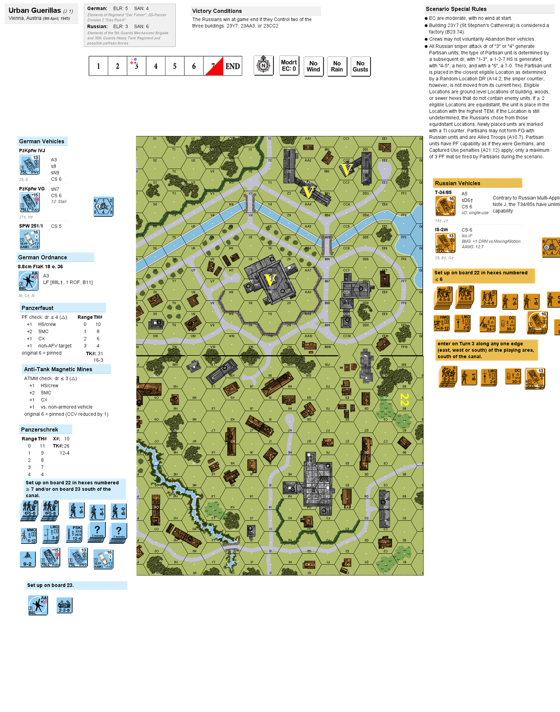 The 2nd SS-Panzer Division, “Das Reich”, formed a rear guard position in Vienna as the Fourth Ukrainian Front closed in on the beautiful city. One area of bitter fighting was around the picturesque Prater Park with St. Stephen's Cathedral. The people of Vienna did not want their beautiful city to suffer the same fate as Warsaw and Budapest. So the local leaders made a deal with the Russians: help would be available if the artillery bombardment was called off. (see Misc Rules below)Attacker: Russian / Partisan (5th Guards Mechanized Brigade and 30th Guards Heavy Tank Regiment with possible partisan forces)