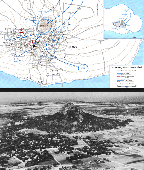 The 1st Battalion of the 306th pushed through the town of Ie and had reached positions near the Government House and the lower slopes of the Iegusugu Pinnacle. The Pinnacle was the nerve center of the Japanese defenses on the island, with fire from it causing the Americans many casualties in the preceding days. After beating off several fierce Japanese attacks during the night, the 306th was ready to attack the final Japanese bastion on Ie Shima.Attacker: American (Companies A and B, 1st Battalion, 306th Regiment, 77th Division/306th Regimental Cannon Company and 706th Tank Battalion)
