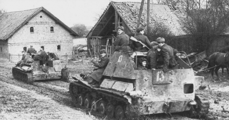 Soviet self-propelled guns SU-76 with troops sent to the last German positions in the Vistula Lagoon. City district Heiligenbeil.