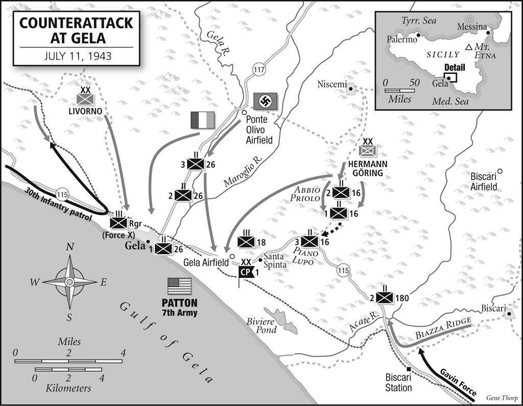 During the pre-dawn hours the U.S. 7th Army successfully landed at both Licata and Gela. Unaware of each others plans, the Italians and Germans began a series of uncoordinated attacks against the Americans with the intention of breaking through to the beachhead. In the Gela area, the Italians were attacking with a mobile armored force while on the eastern edge of the invasion came two columns of the Hermann Goring FallschirmPanzer Division. One of these columns was busy engaging the Americans at Piano Lugo, the other attacked the inexperienced 45th “Thunderbird” Division at Biscari Station. With their Tiger tanks unable to keep pace in the dense olive groves of the region, the German infantry would have to overwhelm the Americans without armor support.Attacker: German (Panzergrenadier Regiment 1, Hermann Göring FallschirmPanzer Division)