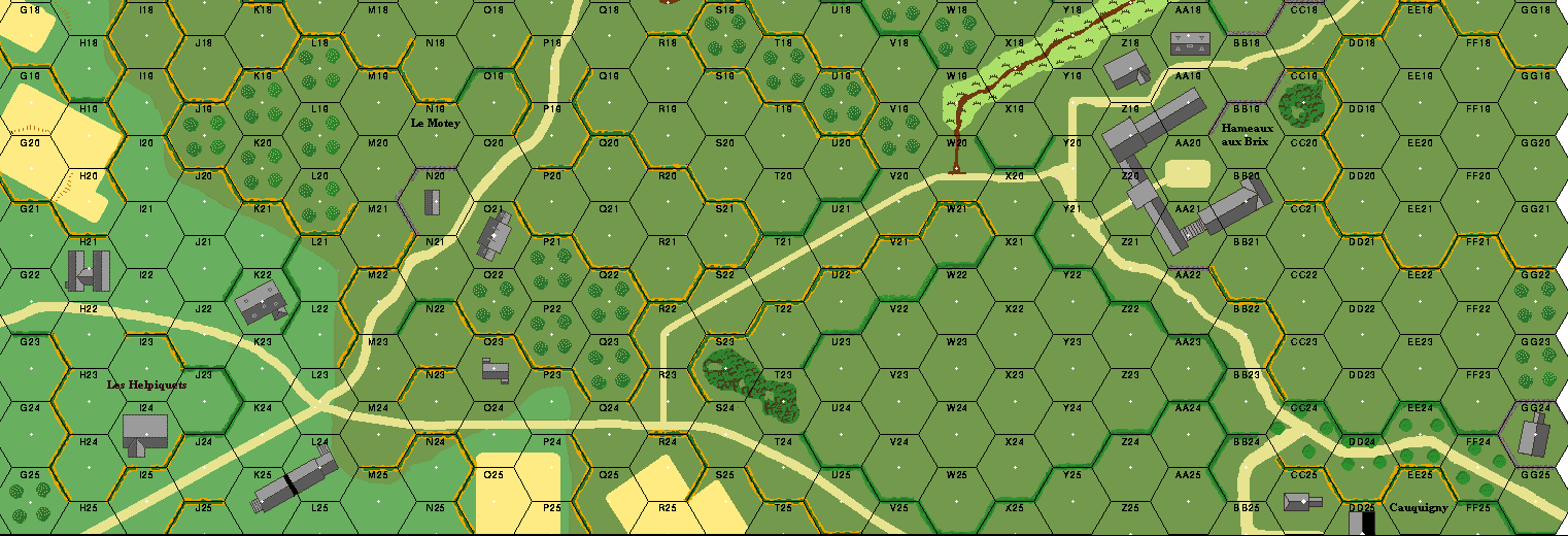 Captain Ben Schwarzwalder was elated to find Cauquigny already in friendly hands. Now there was no need to fight for possession of the Cauquigny bridgehead, which seemed firmly held. He prepared to move on. Schwarzwalder sent Lt. Marr forward on point, assuming that his direction should be westwards, towards his original objective of Amfreville. When the presence of Timmes' force was realyed to him, he reconsidered and led his force northwards, seeking Timmes. This scenario investigates the possibility of Schwarzwalder taking the road west, directly into the path of the German assault.Attacker: American (Scratch force comprising elements of the 508th P.I.R. with glider pilots and anti-tank gunners)