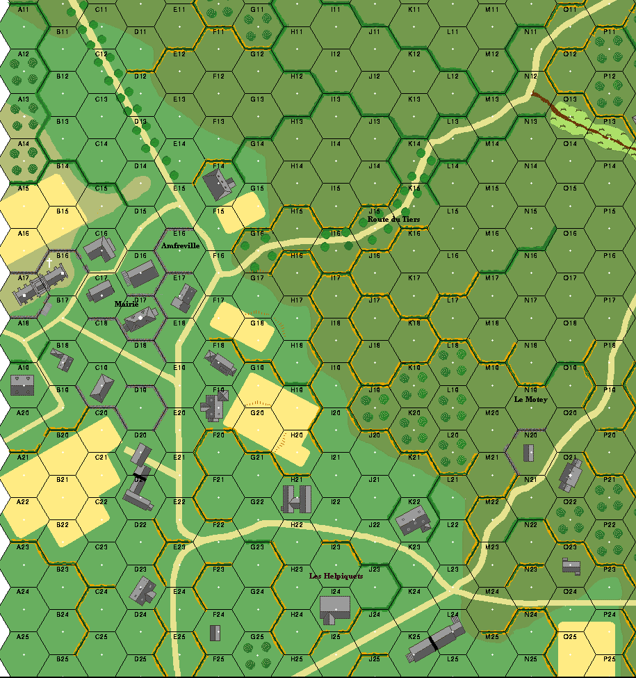 By mid-morning Timmes had over a hundred men digging in around the buildings and gardens of les Heutes. Timmes' own CP was established under the trees of a bocage-lined orchard. One detail requisitioned the farmer's donkey to haul supplies from gliders in the flooded marsh, while another group of paratroopers helped the farm hands to deliver a new born calf -- which was duly named '6th June'. As the afternoon progressed, the volume of long range fire from the Gray Castle steadily rose, and shadowy figures were spotted infiltrating closer along the hedgerows.Attacker: German (Elements of the 1057th Grenadier Regiment)