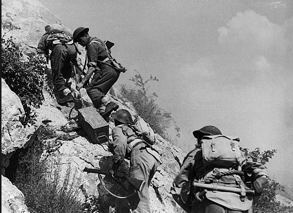Polish troops carrying ammo at Monte Cassino