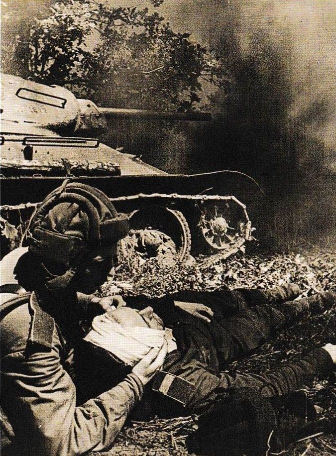 A Soviet soldier from a stricken T-34 tank provides the first aid for his wounded comrade. The Battle of Prokhorovka, 12 July 1943