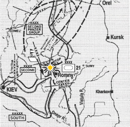 The Germans had just closed the door on Soviet troops trapped in the great Kiev pocket. An ever tightening grip was exerted as more troops were placed into the lone. Sporadic, disorganized attempts were made to break out of the encirclement. In a sector controlled by the 3rd Panzer Division, a stand off had developed. A battalion of German assault guns were sent to plug the line.Attacker: German (Elements of Sturmartillrie Abteilung, 3rd Panzer Division)