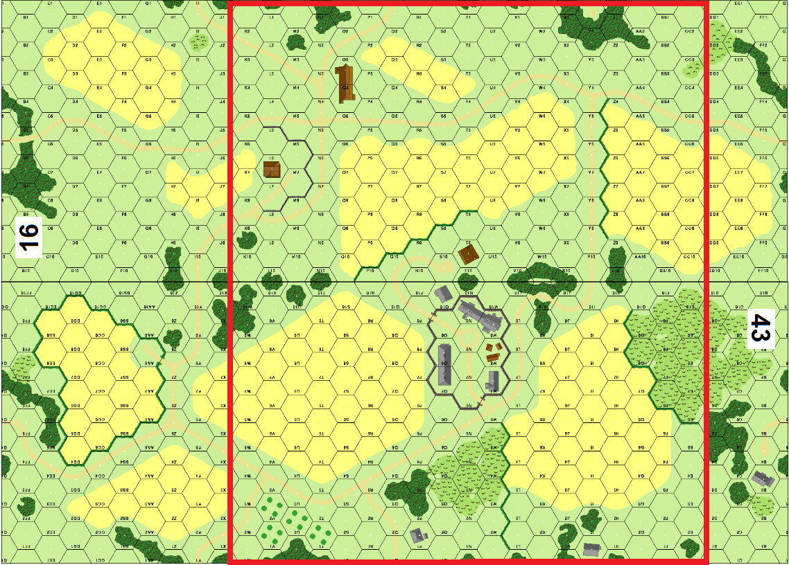 | Misc Rules: | Bldg 43N9 has RB Cellar (O6), D: FB (B23.9). Ground soft, AFVs +1/2 MP extra per hexside. |