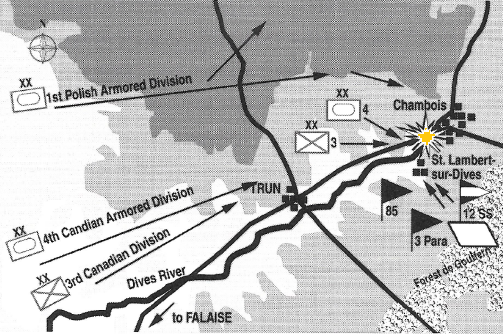 At 0535 hrs, B Company of the Argyll and Sutherland Highlanders of Canada and C Squadron of the South Alberta Regiment, under the command of Major D.V. Currie, started down the road toward the outskirts of St. Lambert. The lead tanks of the assembled force were knocked out on the outlying edge of the village by enemy panzers and a rabble made up of SS grenadiers, parachutists and Wermacht soldiers. Currie's own tank nailed a Panzer IV while a group of soldiers from the Argylls worked their way forward. ..Attacker: Canadian (B Company, Argyil and Sutherland Highlanders of Canada supported by C Squadron 29th Reconnaissance)
