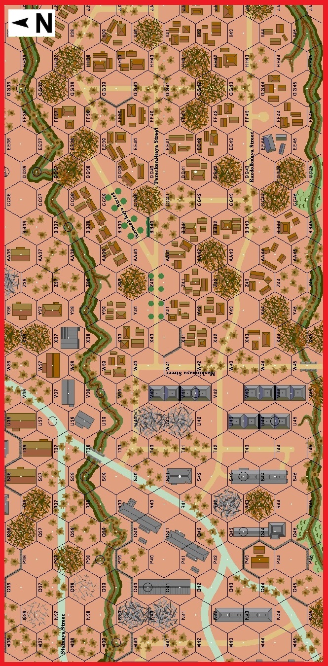 This scenario is played like a Red Barricades CG except that it is only one scenario long. Initial OBs and CPP are provided (Russian 18 CCP -- German 18 CCP and 20 FFP). . . The Russian bridgehead on the western shore of the Volga was reduced to a narrow strip of terrain. Between the Barricady and the Red October factories the German assault groups were only 400 meters from the Volga, posing a major threat to the Soviet reinforcements attempting to cross from the eastern bank. Desperate to buy some time, Soviet Lt. General Chuikov decided to launch a counter-attack. Scraping together three salvaged tanks and about fifty riflemen from various HQ staffs, and even men of a sanitary unit, the attack was launched.Attacker: Russian (62nd Army)