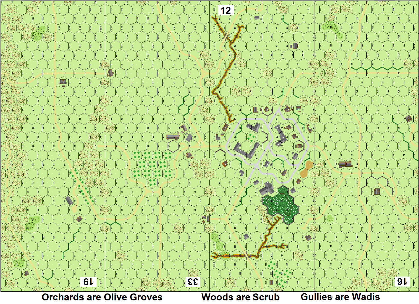 | Misc Rules: | Bldgs: Stone, Orchards: Olive Groves (B14.8), Woods: Scrub (F2), Gullies: Wadis (F5). |