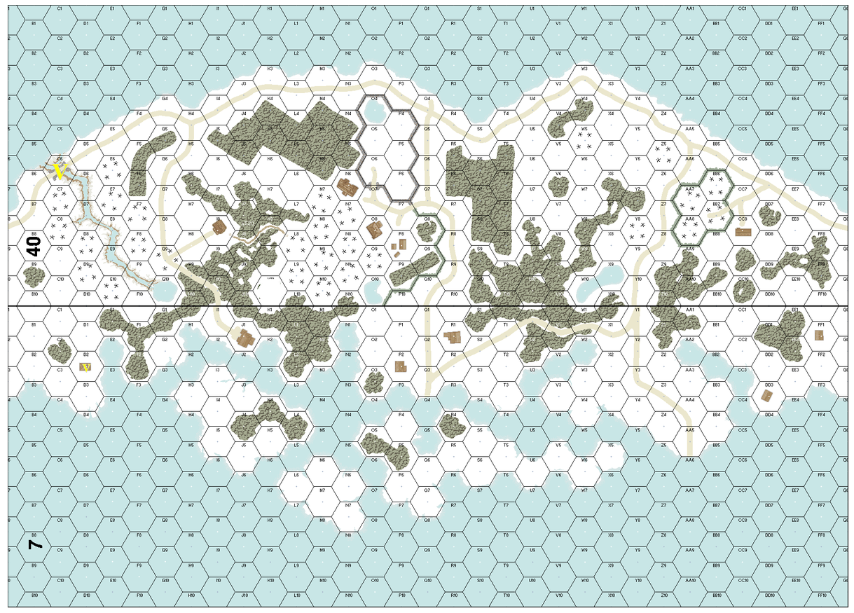 | Misc Rules: | GS, treat Brush and Grain as Woods, no hills, Wooden bldgs |