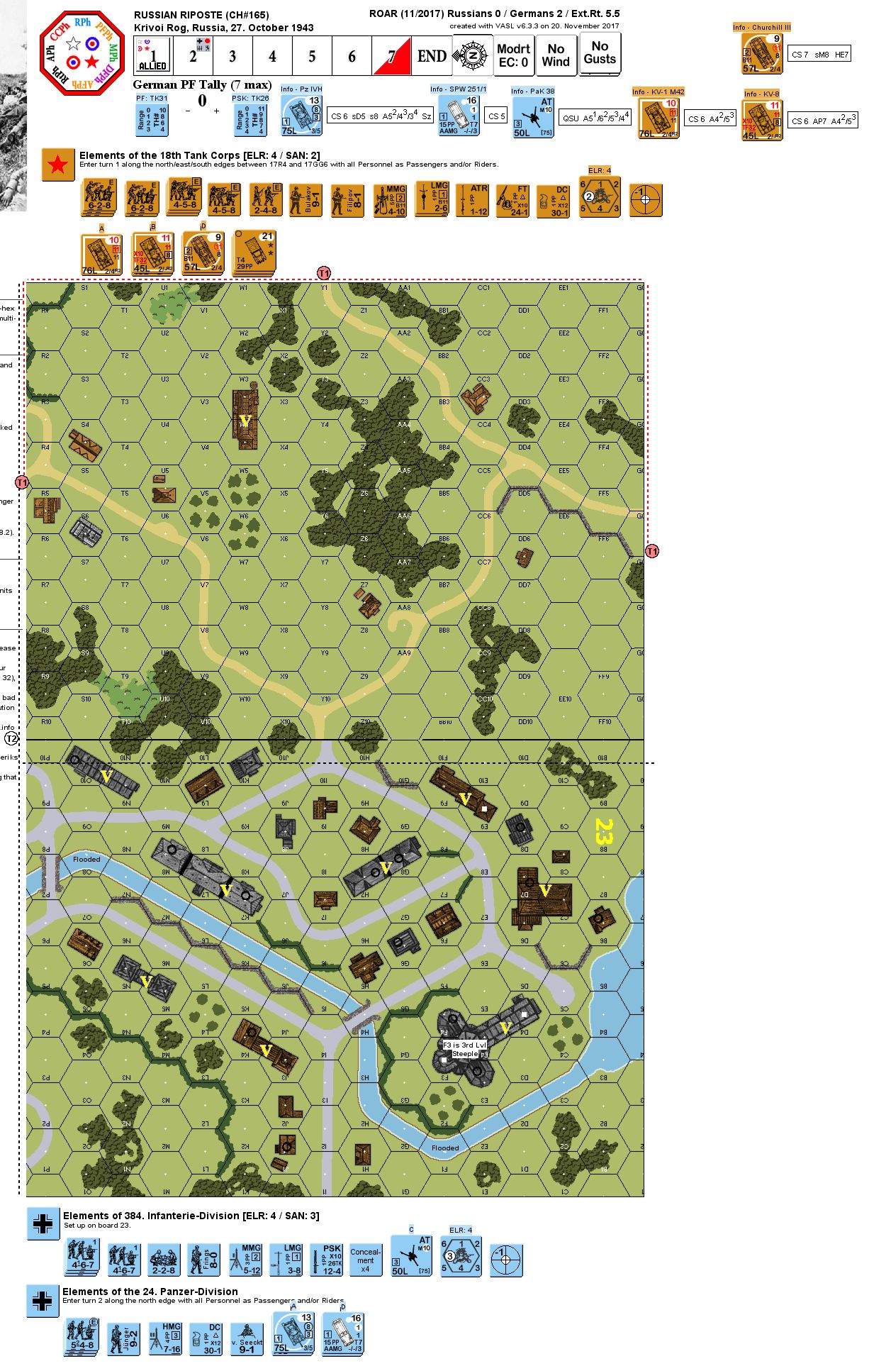 | 2017-12-01 | (D) X von Marwitz | vs | Michael Koch | | Russian win | | A Russian elite force with two FT-tanks and other hard to bust heavy metal enters with Riders and Truck borne infantry. They have to capture some buildings and most importantly the "church" on board 23, which has a 3rd level Steeple in 23F3. The at start German force consists of only 4 squads, one leader and a 50L ATG, which has not the best chances to harm the tanks. The Germans have PF capability, but their range is only 1. The most potent anti-tank asset is the German PSK. One squad equivalent plus SW/SMC may set up HIP. In turn two, the Germans receive reinforcements in the form of 2x Pz IVH and two ht's with elite 3x 548's, a HMG, DC and a 9-2 leader, which must enter as Passengers/Riders.