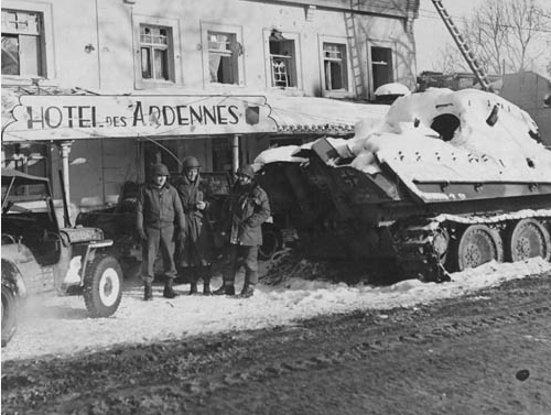 German Panther tank of Kampfgruppe Peiper knocked out in front of the Hotel des Ardennes in Ligneuville, Belgium on December 17th, 1944