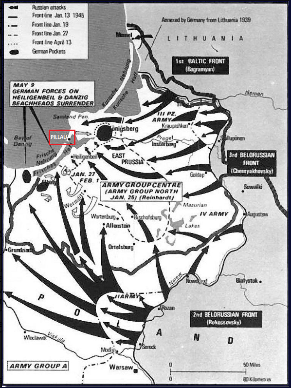 After Königsberg had fallen, the Soviet Army turned its attention to Pillau, which was fanatically defended by the Germans following orders which went out to hold the port at all costs in order to permit every available German ship to take off refugees and soldiers. Some 20,000 German troops fought furiously for six days, inflicting enormous damage on the Russians but with huge casualties on their own side. The Germans finally surrendered Pillau on 26 April 1945.Attacker: Russian (3rd Baltic Front)