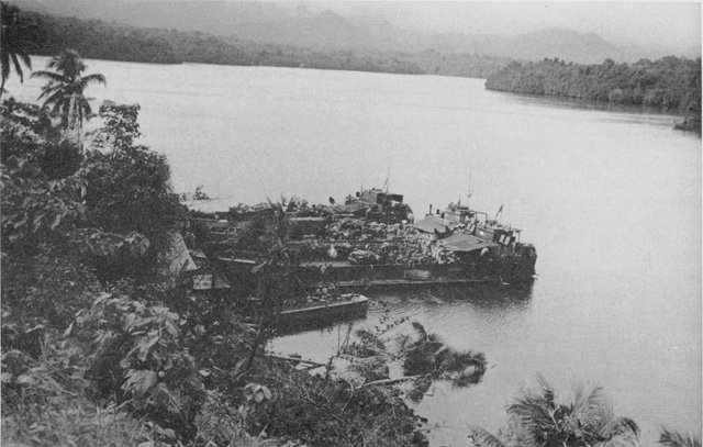 U.S. Navy landing craft unload troops at Viru shortly after the harbor was secured by Marine Raiders on 1 July 1943
