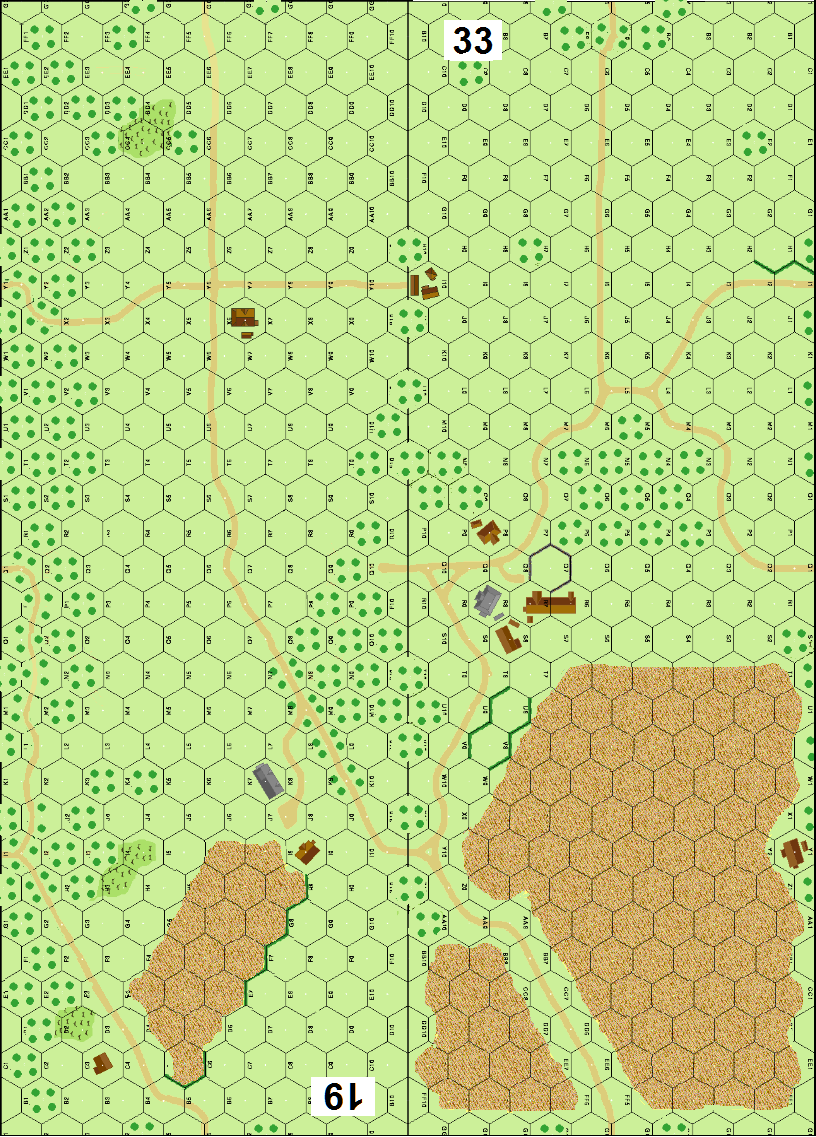 | Misc Rules: | Thick Mist (+1 DRM every 4 hexes). Woods are Orchard hexes. w D: Tr2 |
