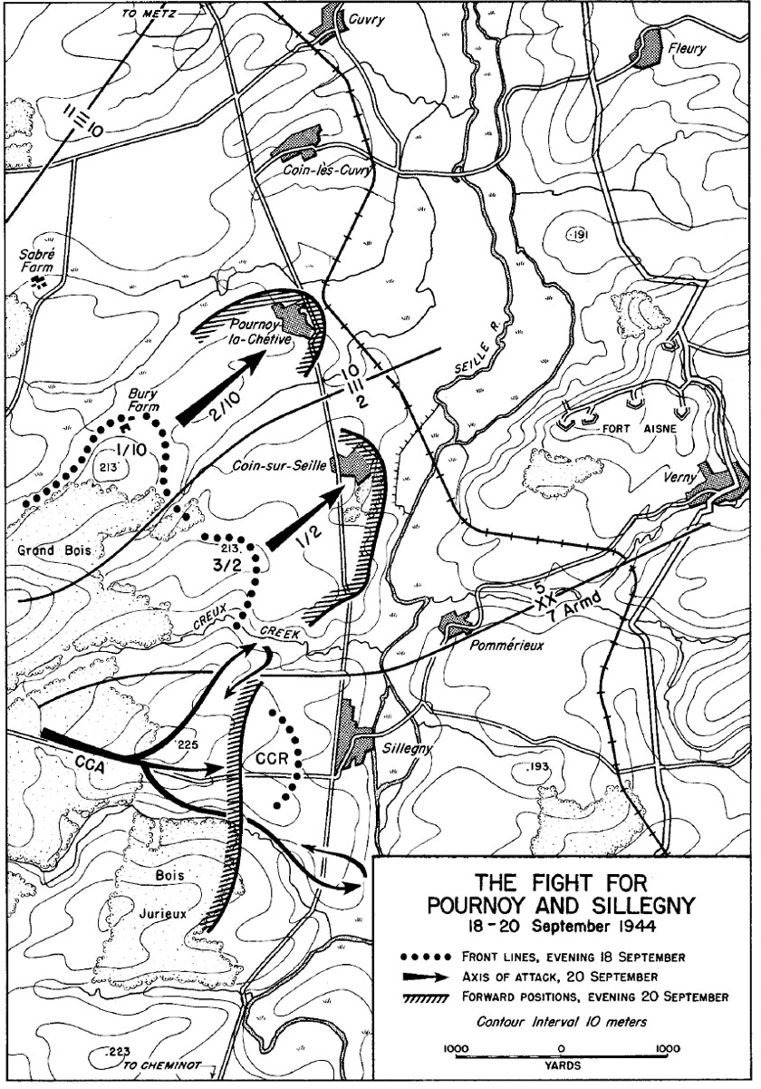 For two days, CCR of the 7th Armored Division attempted to take the town of Sillegny, in order to guard the right flank of CCA, which had to encircle the capture Metz. At last, during the afternoon of 19 September, the Americans entered the town the enemy had evacuated. However, immediately after they received a deadly shelling from the German batteries on high ground overlooking the town. The Germans now moved to counterattack with infantry and tanks.Attacker: German (Elements of the 106th Panzer Brigade)