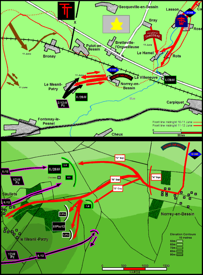 The Canadian 1st Hussars were in support of the Queen’s Own Rifles on this day in the right sector. The objective was some terrain described in the Official Canadian Army history of WWII as “commanding ground near Cheux, south of Norrey”. The Queen’s Own Rifles attacked through the 7th Brigade with strong armor support. The attack gained ground as far as Le Mesnil-Patry but was “stopped in its tracks by very heavy opposition”. The 1st Hussars and the Queen’s Own both suffered high casualties in this latest skirmish with the Panthers of the 12th SS Hitlerjugend.Attacker: Canadian (1st Hussars)