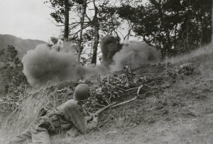 For three weeks the Americans battled through tough hill top defense, often fighting man to man in trenches, foxholes and blasting defenders out of strong caves, taking casualties every step of the way. One of the most fiercely contested positions was known as Norton’s Knob. On the 21st, the 1st Battalion stormed the crest of the hill, surprising the defenders and for 24 hours, the two sides attacked and counterattacked the summit. The Americans who had been lacking artillery support so far in the campaign, found two 90,, AA guns idle and used them to devastating effect on the Japanese bunkers and caves. Soon the CRACK, WHAM of the heavy AA guns sounded across the valley . . .Attacker: American (161st Regimental Combat Team)