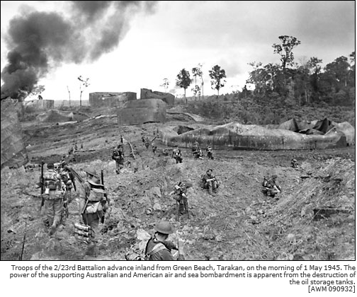In late April 1945 an invasion fleet escorted by the cruiser HMAS Hobart and the destroyers HMAS Barcoo, Burdekin, Hawkesbury, Lachlan and Warramunga arrived off the south-western coast of Tarakan. Supported by heavy naval bombardment, on 30 April engineers destroyed the tangle of defences blocking a landing at Tarakan Island. Preceded by another naval bombardment and with heavy air cover, the 23rd and 48th Battalions went ashore against only light opposition the following day. Within an hour of landing 2/48th Battalion struck some slight opposition on the feature immediately north-east of Lingkas tank farm, but continued to advance and secured its portion of the covering position later in the day. Stiff resistance held up 2/23rd Battalion on a ridge north-west of Milko, which was captured the next day. This enabled the Battalion to advance northward and eastward, one company overcoming Japanese resistance in the King's Goss area. By nightfall on the second day, apart from isolated pockets, the only part of the covering position not held was Hospital Ridge, where the Japanese were strongly entrenched in bunkers and tunnels. This hold-up seriously affected the development of the beach maintenance area, as the road to the north of the contested feature was needed to complete a traffic circuit. The same day 2/48th Battalion occupied Lyons. Against some opposition 2/24th Battalion advanced rapidly to capture two hills nicknamed Sturt and Wills . .Attacker: Australian (Elements of 2/24th Battalion)