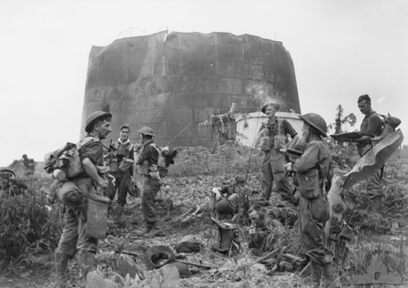 For the Tarakan operations, the three infantry battalions of the 26th Brigade were augmented by the 2/3rd Pioneer Battalion, engineers trained as infantry. During the second week of operations, they were tasked with clearing John's Track, running across the narrow southern end of the island. Optimistically envisioned as a three day walk to the coast, it soon turned into a nightmare of dense jungle, slippery muddy ridges and staunch Japanese defenders. After initial probes against the feature called Helen had been repulsed, the fresh D Company was brought forward. Following a pounding of the hill by artillery, the lead platoon began to struggle up through a slippery tangle of smashed branches. A second platoon began to work their way around to the left. . . .Four and a half Australian squads attempt to dig out 3 crew-served machine guns in a bunker complex.Attacker: Australian (2/3rd Pioneer Regiment)