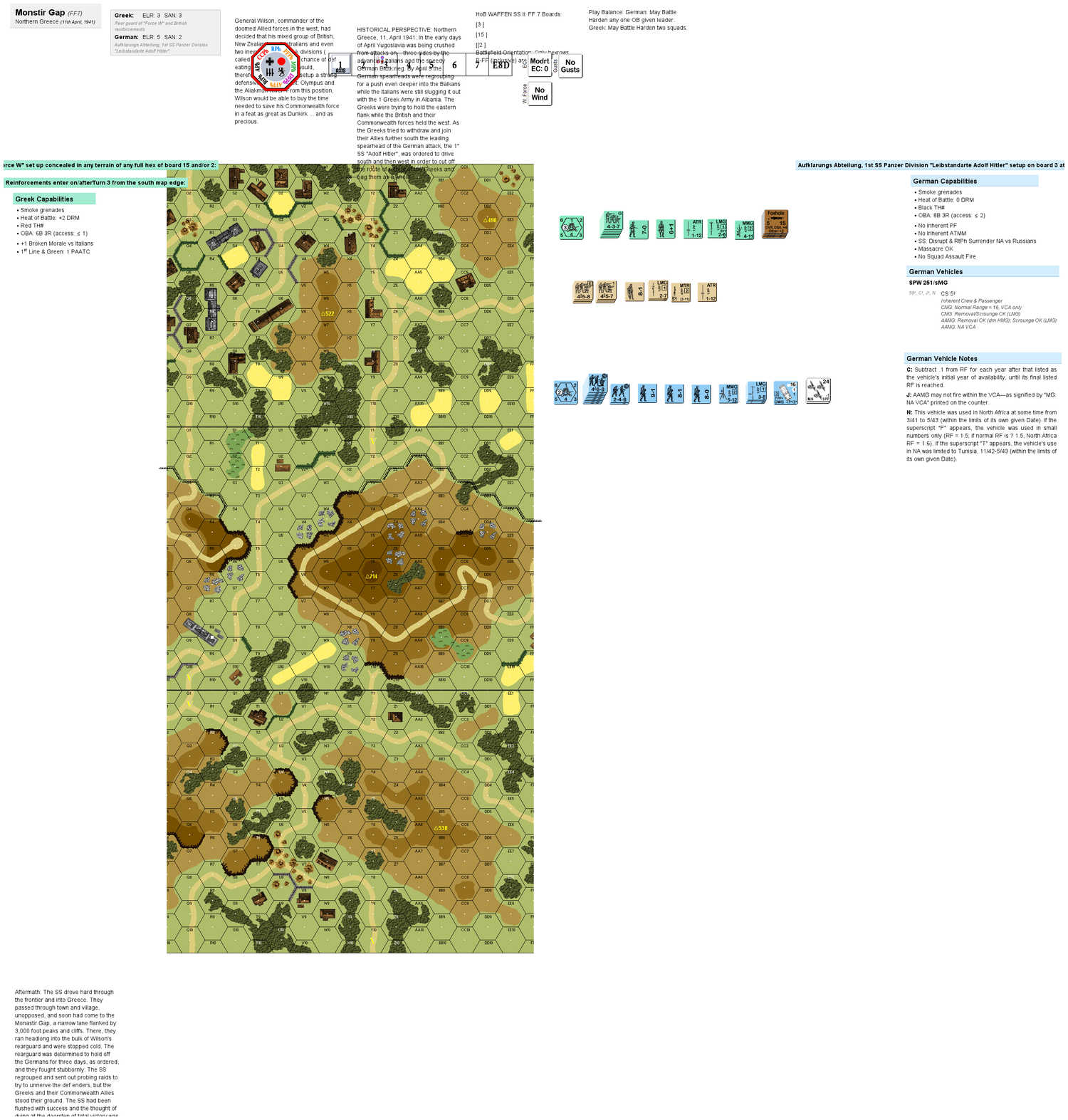 "The failure of the Italians to suppress the Greeks forced Hitler to set loose his dogs, the Leibstandarte Adolf Hitler. Pouring through the Greek mountainside like floodwaters, the SS drove the mixed group of Greeks and BEF across the frontier. In a desperate act, General Wilson ordered a detachment to sacrifice themselves in a rear guard fight. Setting up defensive positions in the neck of 3,000 foot peaks bordered by rocky cliffs, the Allies waited for the brazen SS. .and then wrote their families one last time. ." The one and only time Australian soldiers faced SS troops.Attacker: German (SS) (Aufklarungs Abteilung, 1st SS Panzer Division "Leibstandarte Adolf Hitler")