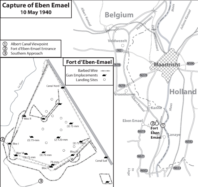 Squad Leader scenario . . . Fort Eben-Emael was designed to defend Belgium from a German attack across the narrow belt of Dutch territory in the region. Constructed in 1931–1935, it was reputed to be impregnable and at the time, the largest in the world. The fort was neutralized by glider-borne German troops (85 men) on 10 May 1940 during the Second World War. The action cleared the way for German ground forces to enter Belgium, unhindered by fire from Eben-Emael.Attacker: German (Groupe Granit of the German 7th Flieger)