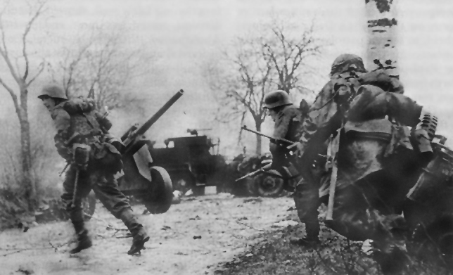 The men of K Company, 3rd Battalion, 110th Infantry Regiment were outposted in the town of Hosingen, located on the main north-south highway just behind the front line. When the Germans opened their Ardennes Offensive on the morning of 16 December, the men of Volksgrenadier Division 26 were to bypass these American nodes of resistance, leaving them to me mopped up by the following units. At 28th Division headquarters, the only reinforcements immediately available were the tanks assigned to the division, the 707th Tank Battalion. In the late afternoon, a medium tank platoon under the command of 1st Lieutenant Robert Payne received orders to attack south along Skyline Drive, push through the German units moving wets, and relieve the embattled K Company -- if it was still there.Attacker: German (Grenadier Regiment 77, Volksgrenadier Division 26)