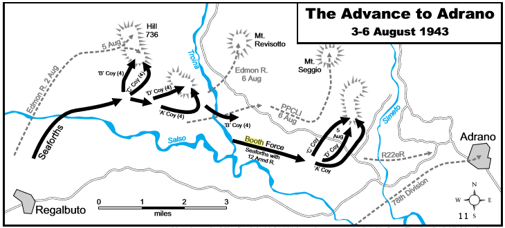 The loss of Agria, Regalbuto and Centruipe to XXX Corps had convinced the Germans to abandon their endangered defenses in front of Catania and to withdraw into the main defensive position around the foot of Etna. Montgomery urged XXX Corps to step up its efforts to capture Adrano, the loss of which would disrupt the German defense. 4 August, the 78th Division continued its push northwards across the Salso and Simeto rivers via Route 121, while the Canadians were to capture Monte Revisotto and Monte Seggio, then force their way through the valley of the Salso. Major-General Guy Simmonds saw one of the rare opportunities to properly utilize tanks.....Attacker: Canadian (Booth Force, 2nd Canadian Infantry Brigade)