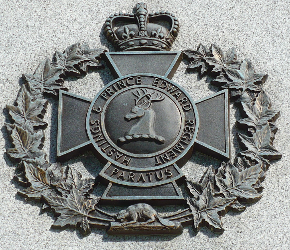 Between two sprays of maple leaves, a Maltese Cross; below the Cross and joining the base of the sprays, a beaver facing dexter, on a log.