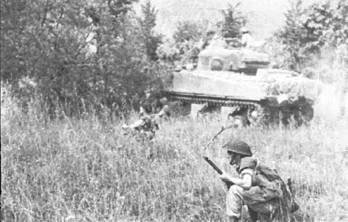 In the centre, the Fifth Division had not been idle. Monte Peloso and Tomba di Pesaro were its primary objectives, but it took most of the day to complete their capture. The original plan called for the Perths and Strathconas to attack Peloso, but this had to be revised when it became apparent that fresh infantry would be needed. The Prince Louise Dragoon Guards, the former First Division reconnaissance regiment, was selected. It was 1310 hours when the attack on Monte Peloso was finally launched. As casualties mounted, Lt-Col. Bill Darling ignored sniper and machine-gun bullets to rally the men and keep them moving forward. By the time the Plugs reached the foot of Monte Peloso, there were only 40 survivors in the two assault companies. With two hundred yards still to go to reach the crest if the hill that was crowned by a church, the Shermans roared up the hillside, knocking down houses still standing, firing their 75s and machine-guns at every little defensive position. . . .Attacker: Canadian (Princess Louise Dragoon Guards supported by "A" Squadron, Lord Strathcoma's Horse)