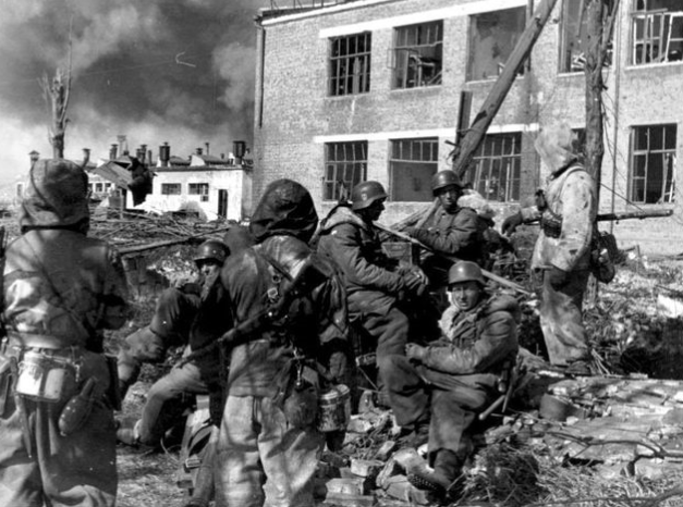 "LAH" assault troops clear a factory area in Kharkov, March They wear insulated winter suits and limited equipment.