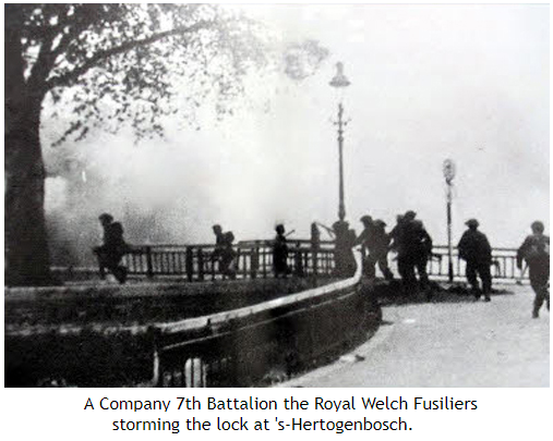 The British 53rd Division had begun their attack on the city two days ago. After a good start, the British had occupied the northern part of the city. 's-Hertogenbosch had several major waterways, being bisected by two rivers, a moat and a canal. Although the German training battalions holding the canal line were weak and without heavy weapons, defending it was easy – especially after the canal bridges were bown. But the canal lock was intact, and so was the footbridge over it. It was agreed that the 7th Battalion the Royal Welch Fusiliers would attempt to cross the canal via the lock. At 16.45 hrs Major John Dugdale's A Company 7th Battalion the Royal Welch Fusiliers supported by the flame throwing Crocodiles of Lieutenant Andrew Wilson's troop from 141st Royal Armoured Corps Regiment (the Buffs) made the mad dash across the lock.Attacker: British (Co. A, 7th Royal Welsh Fusiliers with support from No. 14 Troop, 141 RAC and B Squadron, 5th Royal Inniskilling Dragoon Guards)
