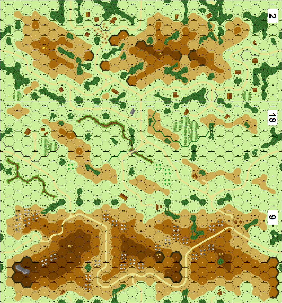 | Misc Rules: | Grain is Vineyards, Brush as Olive Groves. A: Air Support (E7) D: Pillbox (B30) |