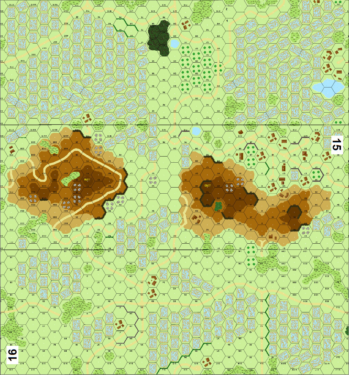 | Misc Rules: | Woods are Brush, Grain is Paddies. Huts. A: Convoy entry w D: Artillery suffers AS and Inexperienced |
