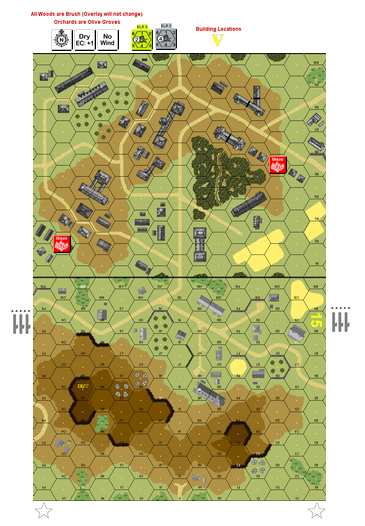 | Misc Rules: | Bldgs: Stone, Olive Groves (B14.8), Woods (not on overlay): Brush. D: FB (B23.9) |