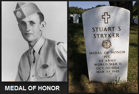 The 17th Airborne Division parachuted onto the north shore of the Rhine River as part of Operation Varsity. The 513th Parachute Infantry was given the mission of seizing the ground along the railway northwest of Wesel. Company E was marching southeast along the railway when it came under fire from a group of buildings, the largest of which was a headquarters site. After advancing on 50 yeards, a platoon making a frontal assault was pinned down by intense fire from the German HQ. The rest of Company E reached a point about 250 yards from the enemy but was unable to make much progress against the position manned by a powerful force of Germans with rifles, machineguns and four field pieces. PFC Stuart Stryker with the lead platoon, exhorted the men to get to their feet and follow him. Inspired they rushed after him in a desperate charge through an increased hail of bullets.Attacker: American (Co. E, 513th Parachute Infantry Regt, 17th Airborne Division)
