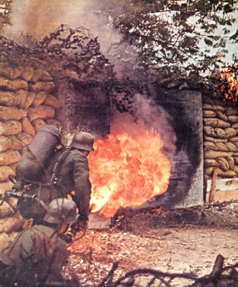 The 2nd Battalion Irish Guards relieved the Welsh Guards around the town of Aam and took up positions along the highway to fend off any German counter attacks against the Nijmegen bridgehead. During the night of September 30, the Germans increased pressure along the British positions with heavy shelling and armored probes closely supported by engineers and infantry. A troop of Sherman tanks restored the situation but at dawn on October 1, the Germans renewed their attack with man packed flamethrowers to burn the Irish out. . .Attacker: German (Elements of Panzergrenadier Regiment 156, Panzerpionier Bataillon 675 and Bataillon 1, Panzer Regiment 24, Panzer Division 116)