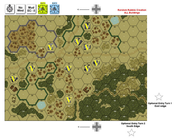 | Misc Rules: | Mud (E3.6), Orchards: Shellholes, RB Cellars (O6.0), Tunnels (B8.6), Both sides have variable OBs. |